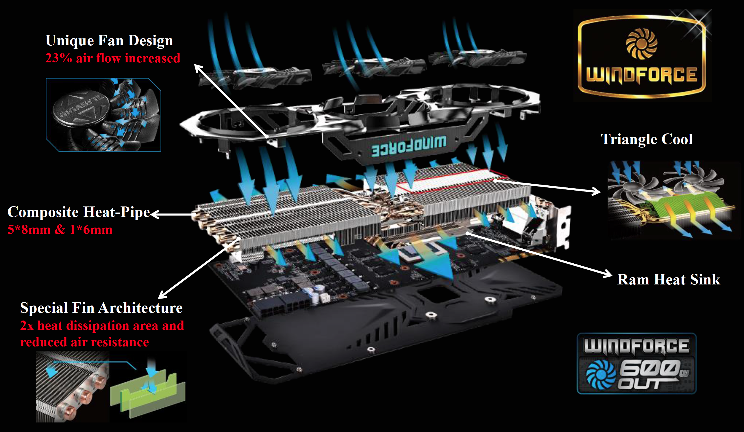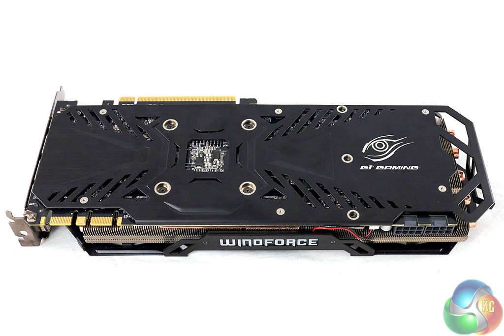 Build quality is high, and the substantial heatsink is clearly visible from all angles. The ‘WindForce' brand name can be seen from the top of the solution – this glows blue during operation.