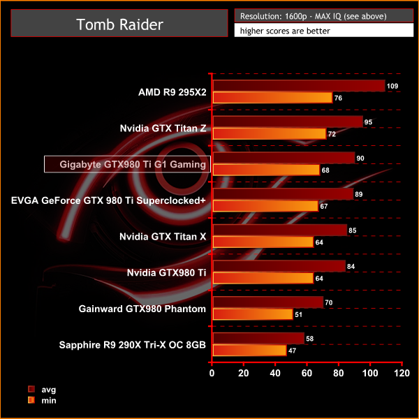 Tomb Raider is demanding at these settings, although the GTX980 won't struggle. We can easily achieve a solid 60fps with the Gigabyte GTX980Ti G1 Gaming.
