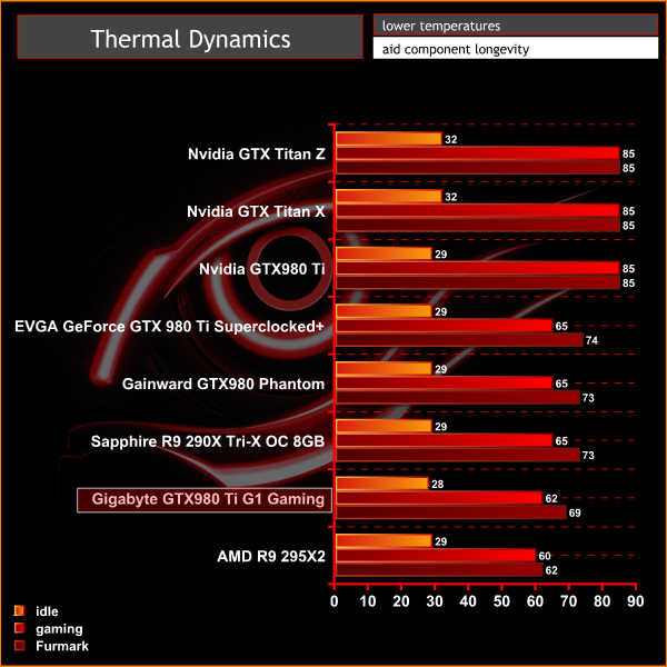 Idle temperatures are improved over the reference card by 16c, under Furmark load and 23c when gaming. Class leading results.