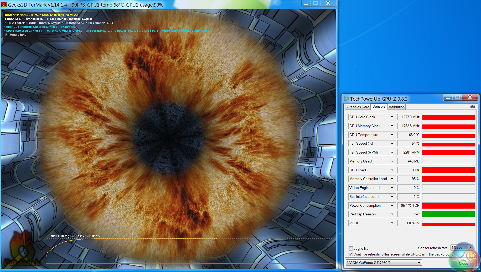 The GPU is using Nvidia’s GPU Boost 2.0 which dynamically adjusts clock speed and voltage settings, factoring in temperatures.