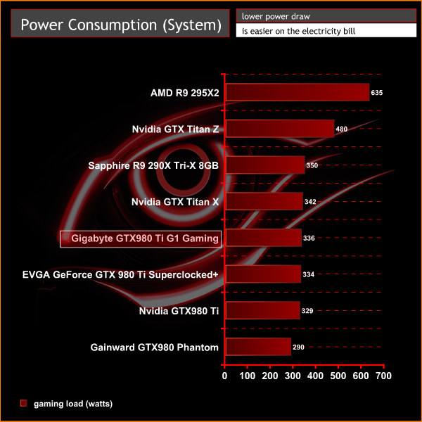 Maxwell cards are always extremely power efficient. As we can see the GTX980Ti system consumes 329 watts under gaming load and the EVGA overclocked card takes around 7 watts more.