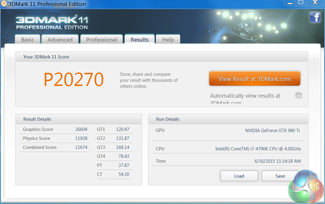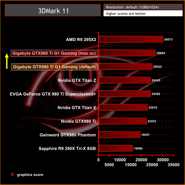 The manually tweaked card exhibits considerable performance benefits from the ‘out of the box' speeds. The final score of 26,604 points puts it ahead of the Nvidia GTX Titan Z.