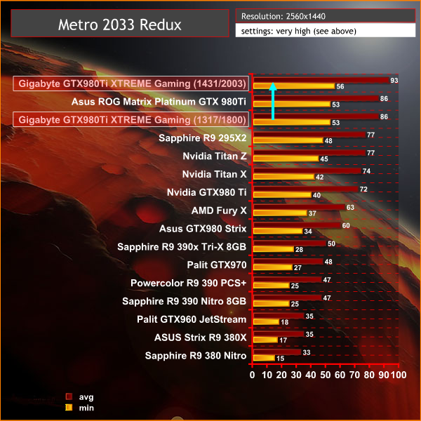 Metro 2033 Redux is a remake of the original game, with enhanced graphics. We often test with Metro Last Light Redux, but decided to mix things around for this review today. We test at 2560×1440 with the following settings: Quality-Very High, SSAA-off, Texture Filtering-16x, Motion Blur-Normal, Tessellation-Normal, Advanced Physx-off.
