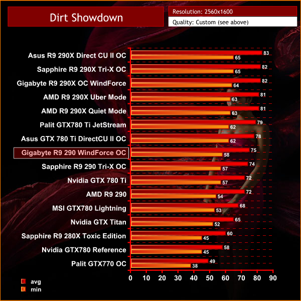 The Gigabyte R9 290 WindForce OC holds the frame rate above 60, almost all the time, dropping once to 58 frames per second.