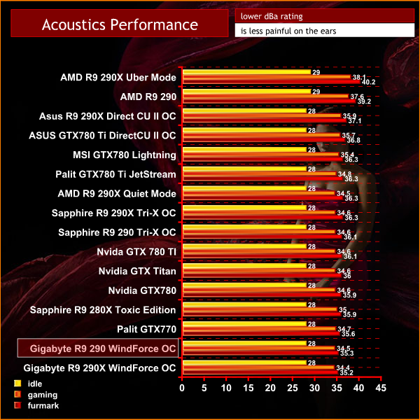The Gigabyte R9 290 WindForce OC is another exceptionally quiet card, rating the same (within margin of readout error) as the 290X version of the hardware.