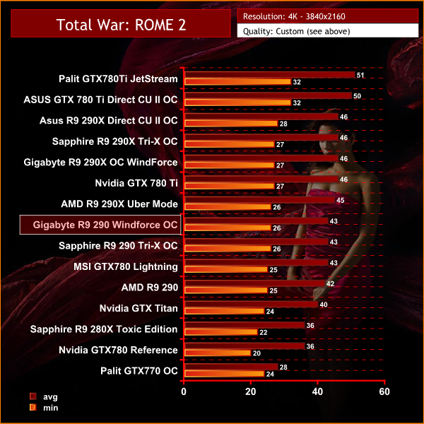 The AMD hardware delivers good performance at Ultra HD 4K, although the Palit GTX780 Ti JetStream takes top position in the chart.