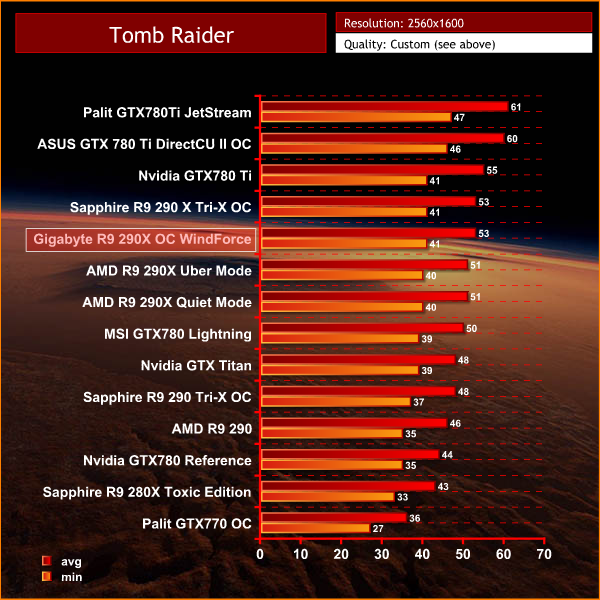 This engine runs well on both AMD and the latest Nvidia hardware. The GTX780Ti dominates this engine as shown in our results, however the Gigabyte R9 290X OC WindForce scores well, averaging 53 frames per second.