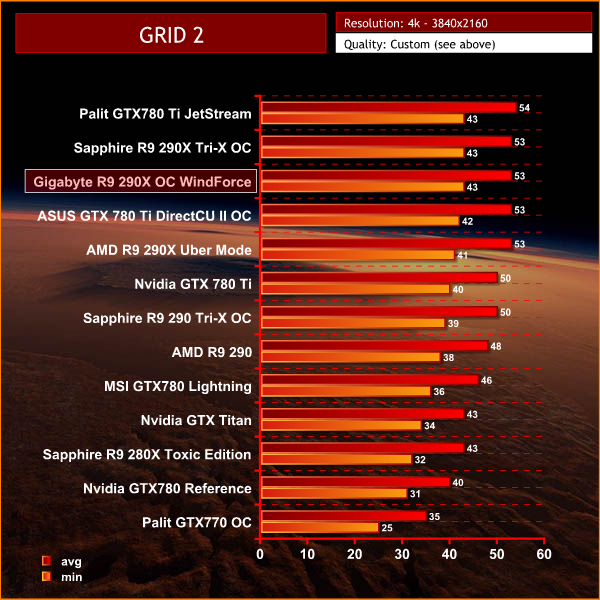 Very closely matched at the top of this particular graph. The Gigabyte R9 290 X OC Windforce averages 53 frames per second, holding a frame rate above 40 at all times.
