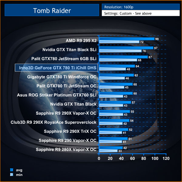 Tomb Raider is still perfectly playable at 1600p while maintaining maximum image quality settings. The Inno3D GeForce GTX 780 Ti iChill DHS claims the top spot in our tests, averaging 64 frames per second.