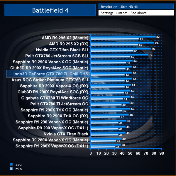 The single Inno3D GeForce GTX 780 Ti iChill DHS manages to compete with the Asus ROG Striker Platinum GTX760 graphics cards, in an SLi configuration.