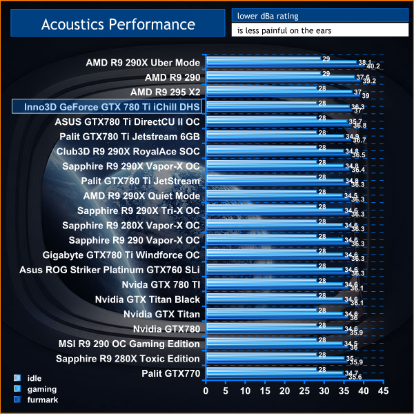 We measure from a distance of around 1 meter from the closed chassis and 4 foot from the ground to mirror a real world situation. Ambient noise in the room measures close to the limits of our sound meter at 28dBa. It isn’t a real world situation to be measuring with a case panel off only a few centimeters away from a video card. Our noise figures may therefore be lower than other publications who record at closer distances, or without a fully closed case muting the noise.