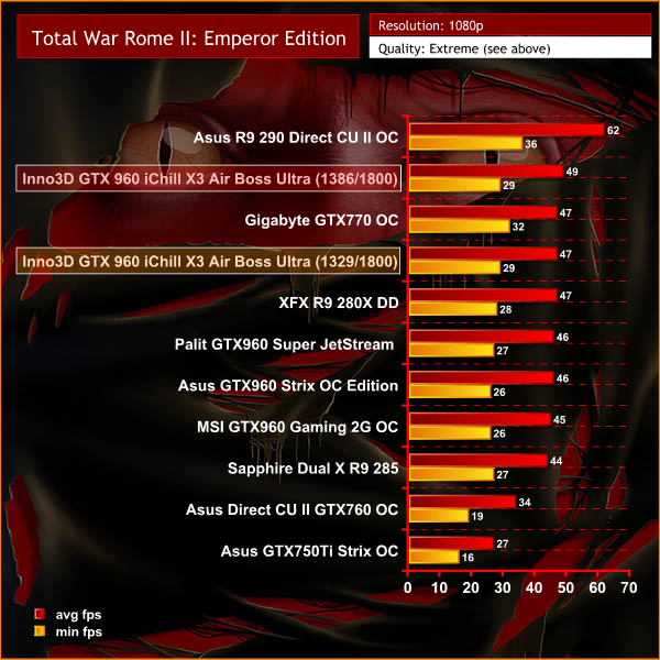 If you want solid 60+ frame rates then you will need to lower image quality, or invest in high end graphics solutions. To be fair, most people would be pleased with the performance from the Inno3D GeForce GTX 960 iChill X3 Air Boss Ultra.