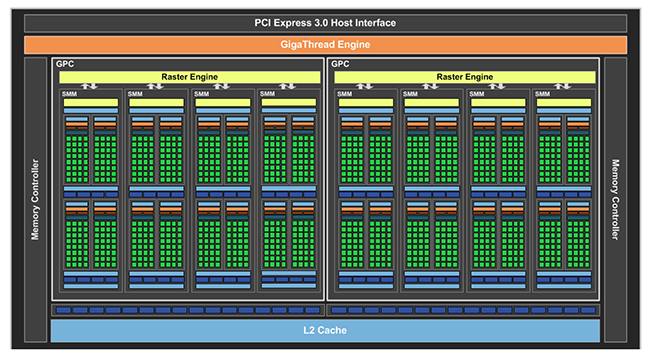 Each of the GM206 SMM units have their own 96kb shared memory, and the L1/texturing caching functions are combined into a 24kb pool of memory per pair of processing blocks (48kb per SMM). Previous Kepler GPU's had a smaller 64kb shared memory function which was also shared as a L1 cache.