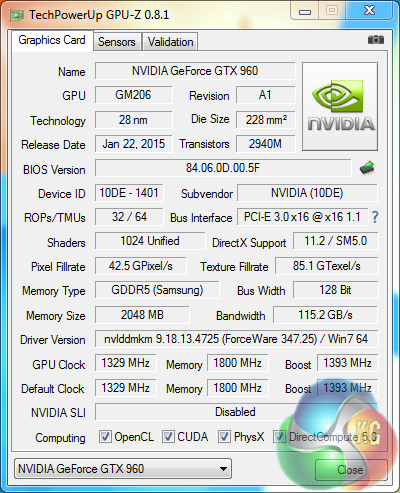 Inno3D have cranked the GM206 core on this card very highly, to a core clock speed of 1,329mhz – the highest we have tested yet. The Boost speed is running close to 1,400mhz out of the box, at 1,393mhz. The memory receives a boost to 1,800mhz (7.2Gbps effective) from 1,753mhz (7Gbps effective).