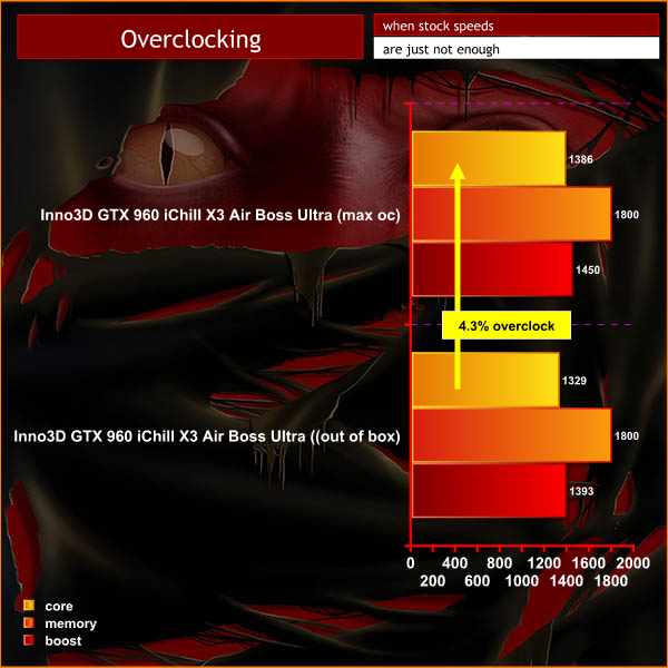 As the majority of our readers are likely to buy a GTX960 to run in a highly overclocked state, we felt we would get the overclocking section out of the way, first. Throughout this review we will run all tests with the Inno3D GeForce GTX 960 iChill X3 Air Boss Ultra at ‘out of box' speeds, as well as the maximum stable overclocks we were able to achieve.