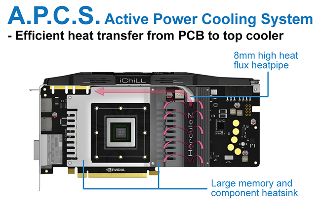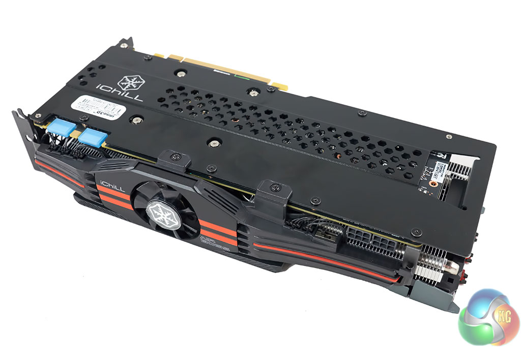 Three large fans take centerstage behind the thick (and heavy) metal cooler shroud. Inno3D call the cooler – the HerculeZ X4. The card is equipped with a vented back plate – they call this the HerculeZ Backplate II.