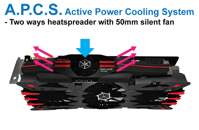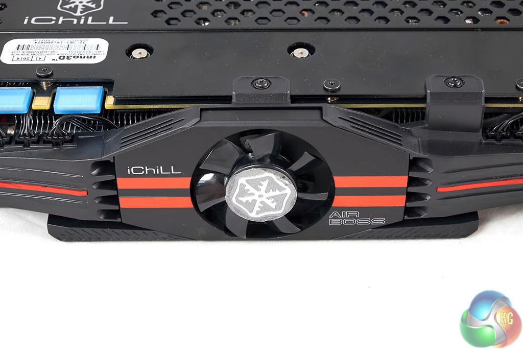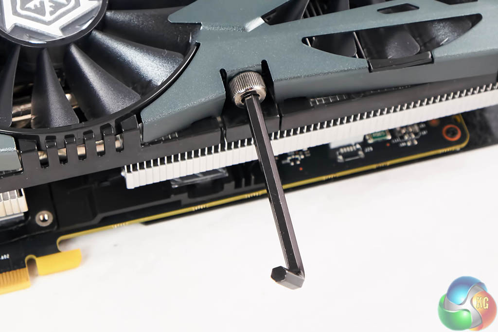 There is also a smaller 50mm fan mounted separately along the top ridge of the PCB. The main AirBoss Fan Blades have ‘airflow' channels' cut into them to improve the movement of air by 20%. Inno3D include an allen key to get access to the fans for cleaning.