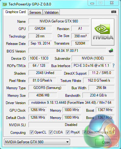 The GTX980 is built on the 28nm process. It has 2,048 Cuda Cores, 64 ROP’s and 128 Texture units. The 4GB of Samsung GDDR5 is running at 1,800mhz (7.2 Gbps effective) and is connected via a 256bit memory interface. The core clock speed has been increased by INNO3D to 1,266mhz with a boost speed set at 1,367mhz.