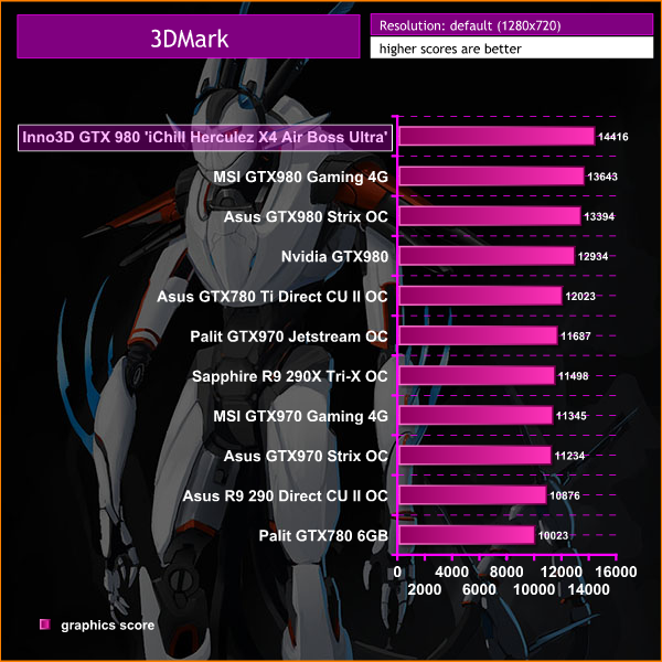 Another remarkable score from the Inno3D GTX 980 ‘iChill Herculez X4 Air Boss Ultra', scoring 14,416 points – and claiming top position in our chart.