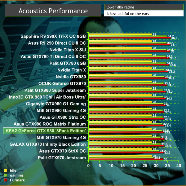 The custom cooler on this card runs very quietly, almost inaudible under most load situations – and better than any other GTX980 we have tested to date. Under synthetic load, the fan speeds rise a little further, hitting just over 33dBa.