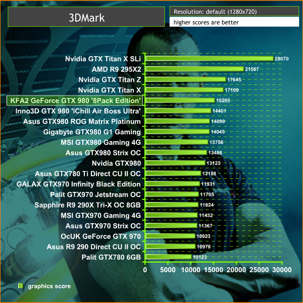The KFA2 ‘8Pack Edition' is the fastest GTX980 we have tested, scoring 15,205 points., around 1,900 points behind the reference clocked GTX Titan X.
