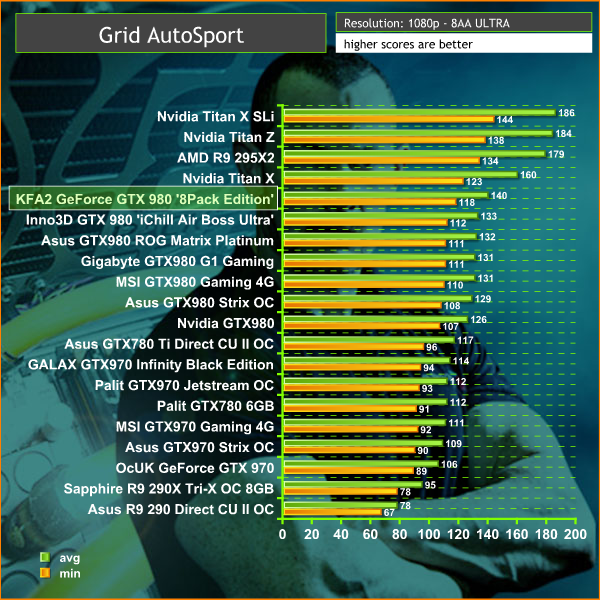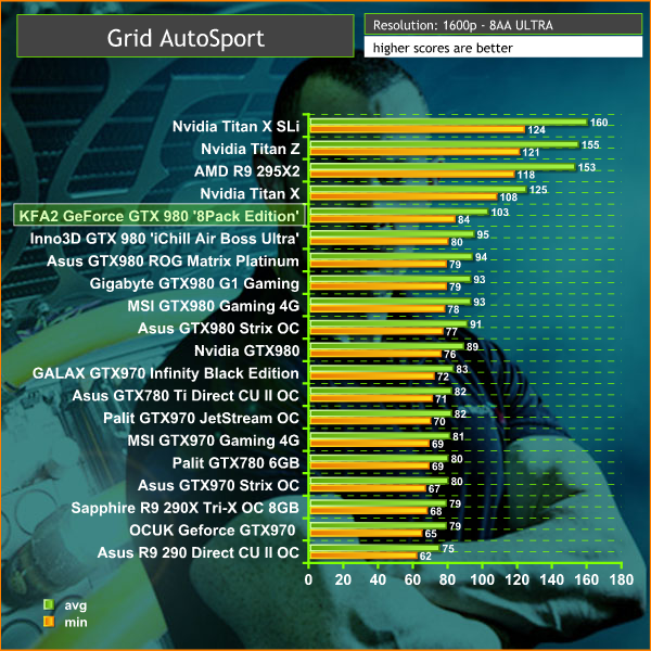 The KFA2 GeForce GTX 980 ‘8Pack Edition' averages 103 frames per second, putting it ahead of all the competition, and behind the Titan X.