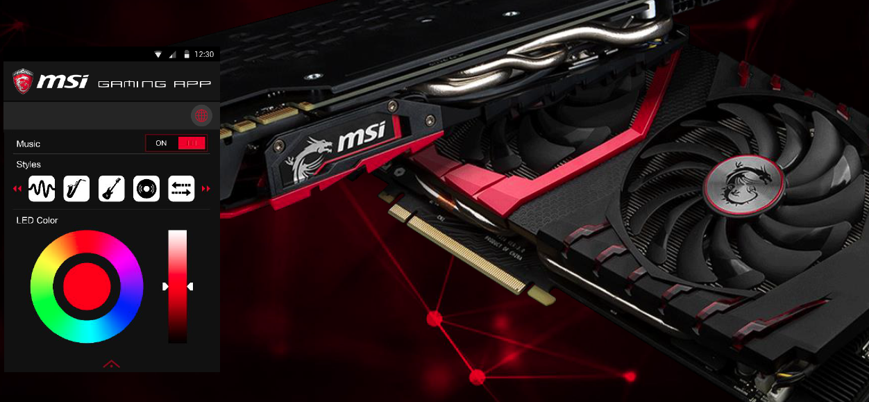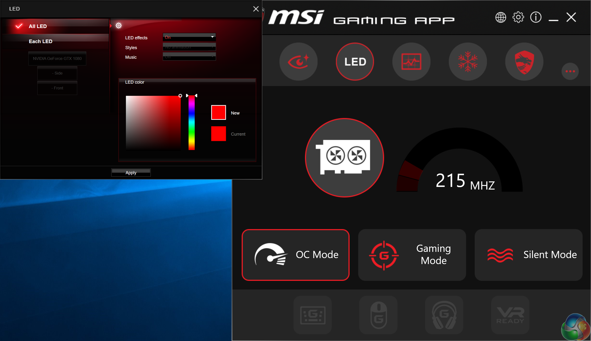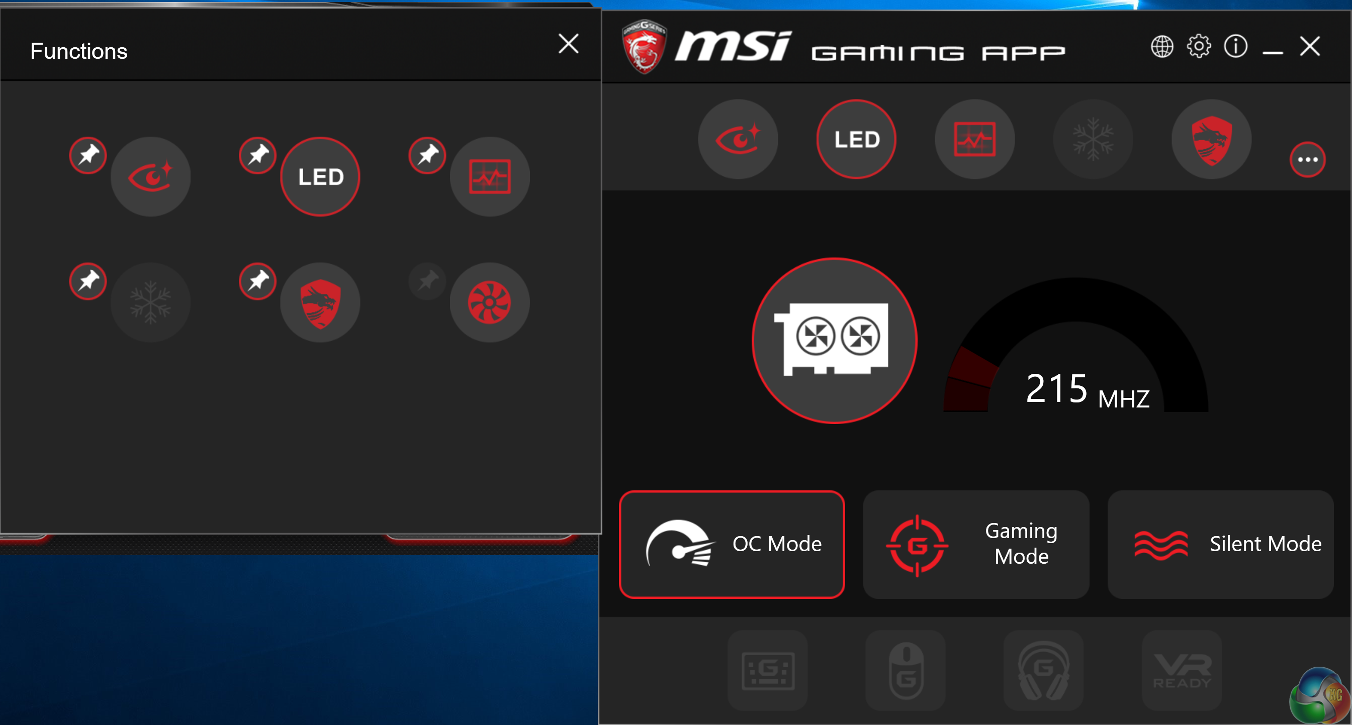 MSI include two useful software packages with the graphics card – the MSI Gaming App, and MSI Afterburner. The MSI Gaming App offers three preset clock and fan profiles, and you can also adjust LED colours and monitor the hardware.