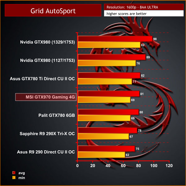 The MSI GTX970 Gaming 4G battles with the Palit GTX780 6GB, slightly behind at 1080p, but slightly ahead at 1600p.