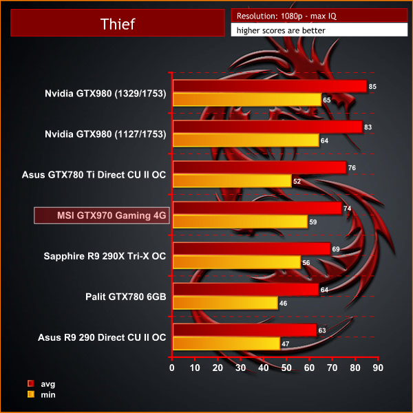 Thief looks great on the latest Nvidia hardware – and the GTX980 claims the top spot by a clear margin. The MSI GTX970 Gaming 4G scores well at both resolutions, outperforming the more expensive Sapphire R9 290X Tri-X OC at 1600p.