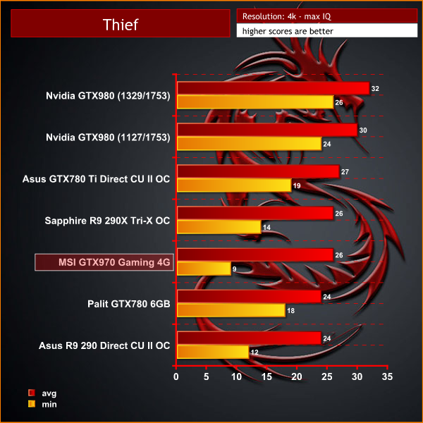 Powering Thief at high image quality settings at 4K resolution proves a little too much for the MSI GTX970 Gaming 4G – we also noticed some big drops in frame rate in specific areas of the environment.