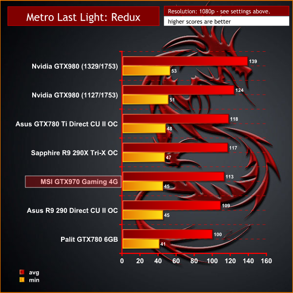 I just tested my MSI GTX 970 Gaming 4G (at stock like here with exactly the same settings) and my Average: 45 fps and Max: 118. You show the same numbers as the Min and Average respectively.