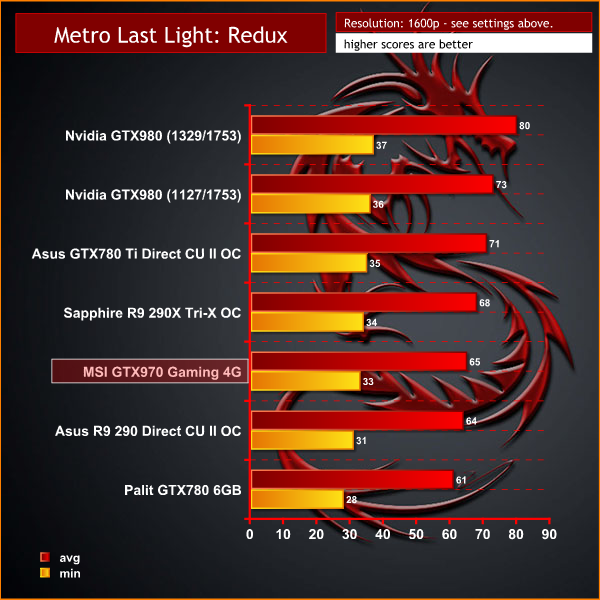 Excellent performance at both 1080p and 1600p, maintaining smooth frame rates. The MSI GTX970 Gaming 4G outperforms both the Asus R9 290 Direct CU II OC and Palit GTX780 6GB solutions.
