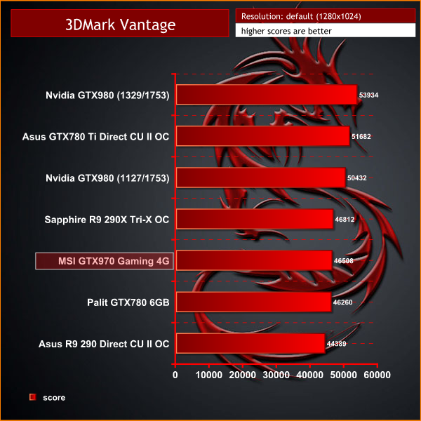 The MSI GTX970 Gaming 4G scores well in this older Direct X 10 benchmark, outperforming the Palit GTX780 6GB.