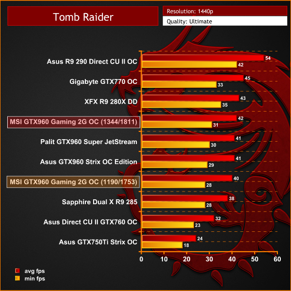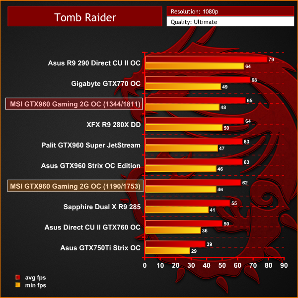 At default clock speeds the MSI GTX960 Gaming 2G OC is outperformed slightly by the faster cards. Our maximum overclocked speeds however highlight potential performance gains.