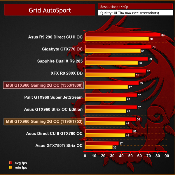 Good gameplay performance at both 1080p and 1440p resolutions. When overclocked, the frame rates increase proportionally.