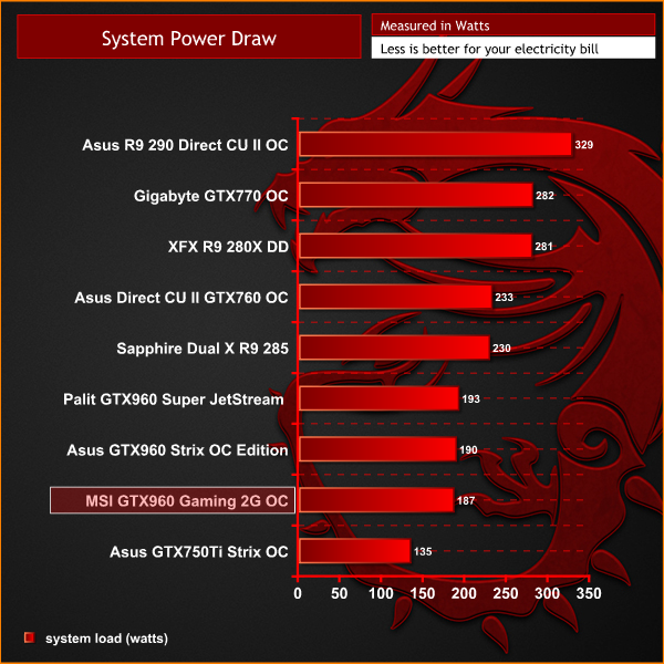 The MSI GTX960 Gaming 2G OC Edition system demands 187 watts under load, a couple of watts less than the Asus GTX960 Strix OC Edition under the same conditions.
