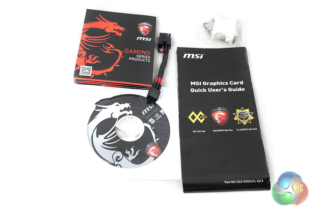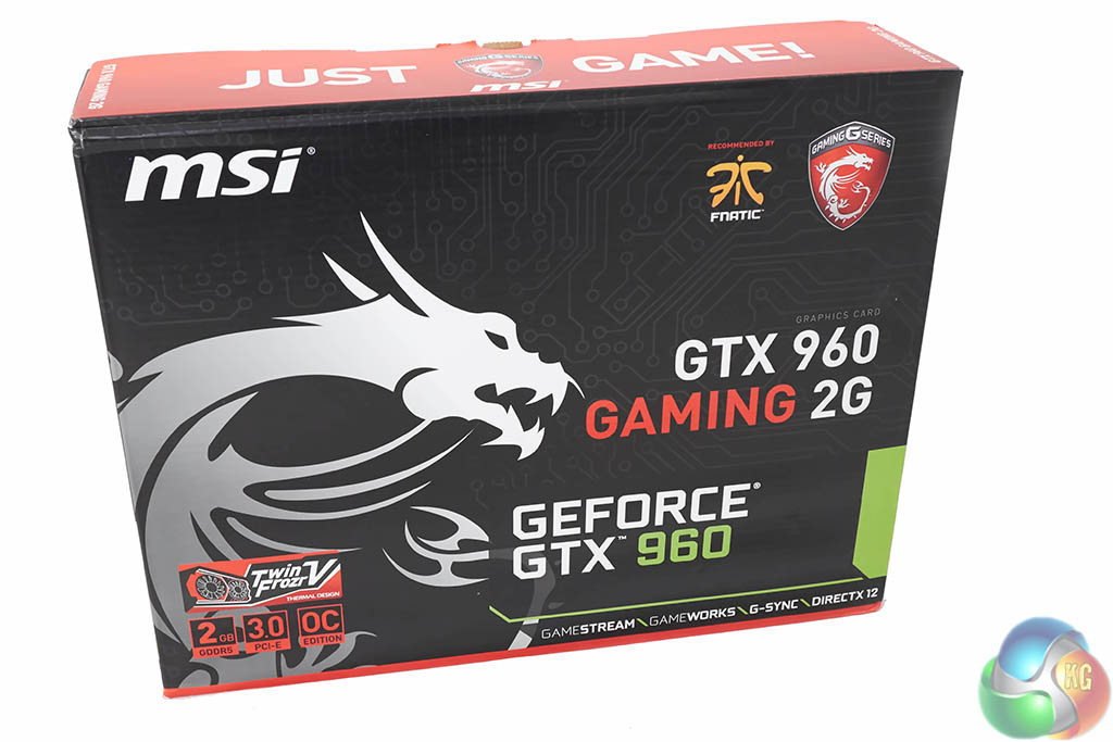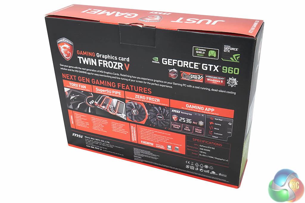 The MSI GTX960 Gaming 2G OC ships in a instantly recognisable box featuring their Dragon logo. Some details are highlighted on the front of the box – including the Twin Frozr V cooler.