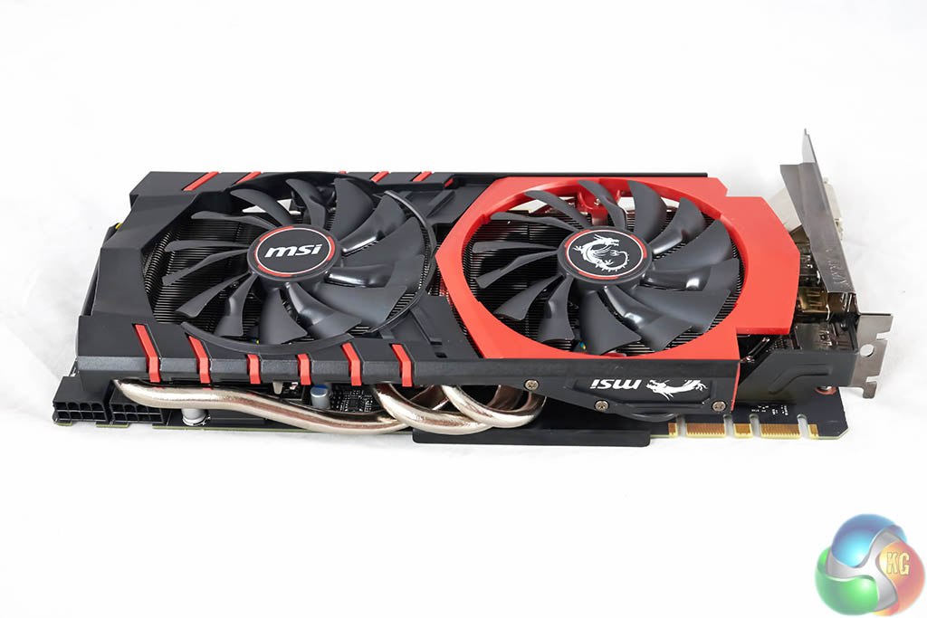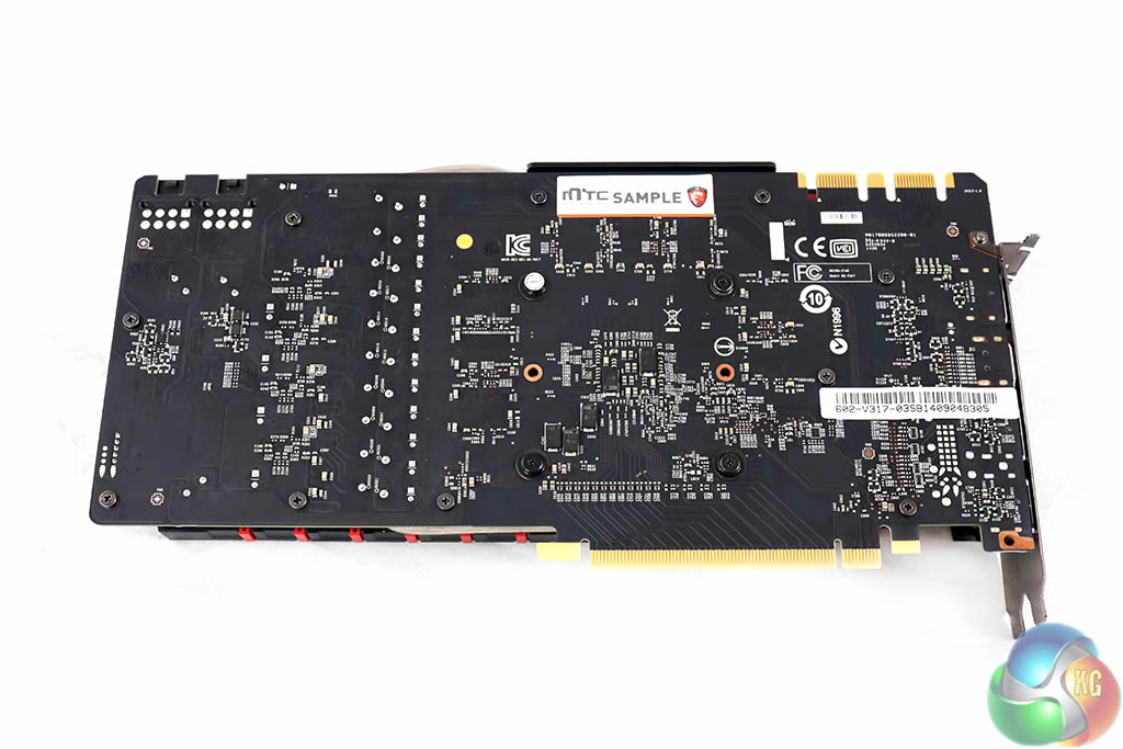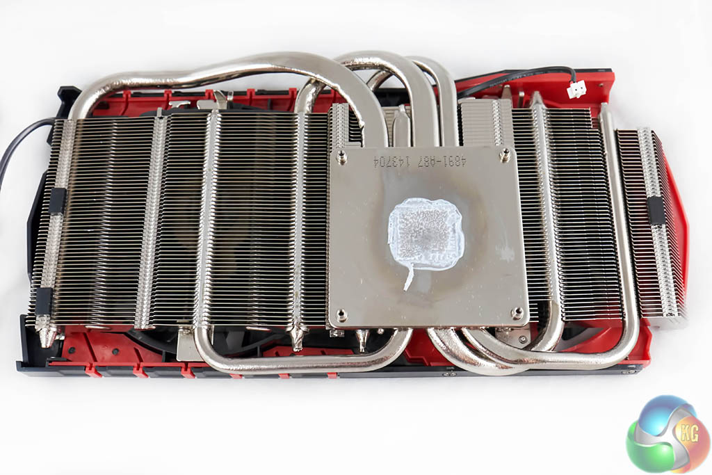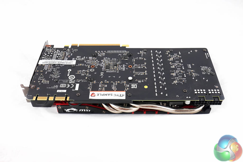 The new MSI cooling system looks formidable. There are four heatpipes in total. These are all running into various positions into aluminum fins on either side of the cooling base. High grade Samsung GDDR5 memory features on this card, cooled by a dedicated heatsink.