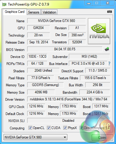 The GTX980 is built on the 28nm process. It has 2,048 Cuda Cores, 64 ROP’s and 128 Texture units. The 4GB of Samsung GDDR5 is running at 1,753mhz (7 Gbps effective) and is connected via a 256bit memory interface. The core clock speed has been increased by MSI to 1,216mhz with a boost speed set at 1,317mhz.