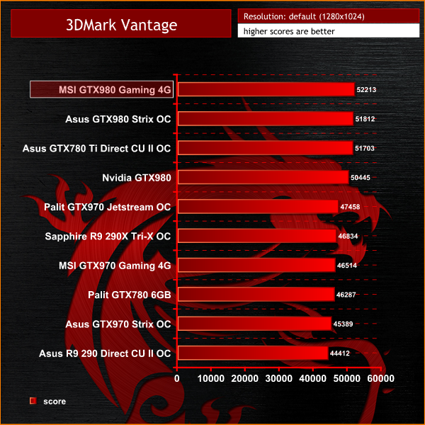 The MSI GTX980 Gaming 4G takes top position in our performance chart for this older Direct X 10 Futuremark benchmark.