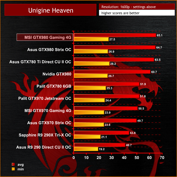 Excellent performance from the GTX980 cards. The MSI GTX980 Gaming 4G claims top position, averaging just over 65 frames per second.