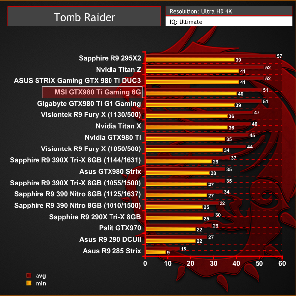 At Ultra HD 4K resolutions, the MSI GTX980 Ti Gaming 6G shines, holding frame rates at 40 or greater at all times.