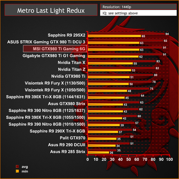 On May 22, 2014, a Redux version of Metro Last Light was announced. It was released on August 26, 2014 in North America and August 29, 2014 in Europe for the PC, PlayStation 4 and Xbox One. Redux adds all the DLC and graphical improvements. A compilation package, titled Metro Redux, was released at the same time which includes Last Light and 2033. (Wikipedia). We test with following settings: Quality-Very High, SSAA-off, Texture Filtering-16x, Motion Blur-Normal, Tessellation-Normal, Advanced Physx-off.