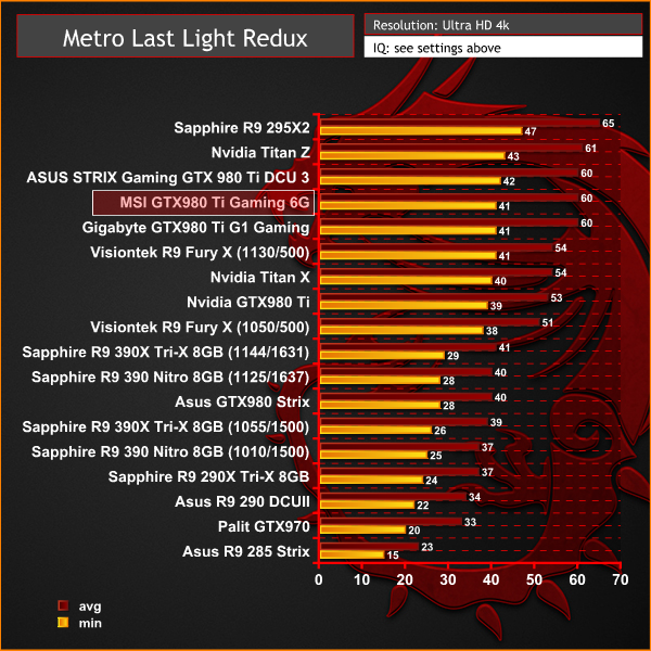 On May 22, 2014, a Redux version of Metro Last Light was announced. It was released on August 26, 2014 in North America and August 29, 2014 in Europe for the PC, PlayStation 4 and Xbox One. Redux adds all the DLC and graphical improvements. A compilation package, titled Metro Redux, was released at the same time which includes Last Light and 2033. (Wikipedia). We test with following settings: Quality- High, SSAA-off, Texture Filtering-16x, Motion Blur-Normal, Tessellation-Normal, Advanced Physx-off.