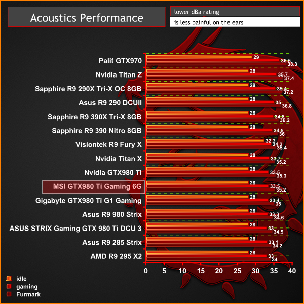 The MSI GTX980 Ti Gaming 6G delivers great cooling performance and remains reasonably quiet at all times. It is very similar in noise levels to the Gigabyte GTX980 Ti G1 Gaming and it would be hard pressed to tell the difference between the two in any kind of real world test. The Aus STRIX GTX980 Ti DCU 3 is the quietest GTX980 Ti we have tested to date.