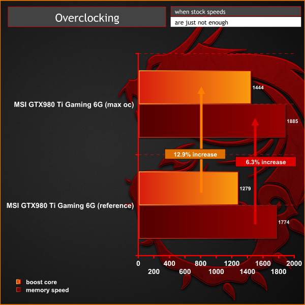 We managed to increase the boost speed to 1,4464mhz translating into a 12.9% increase over the ‘out of the box' results. The GDDR5 memory could be pushed to 1885mhz (7.54Gbps effective) before any artifacting would occur.