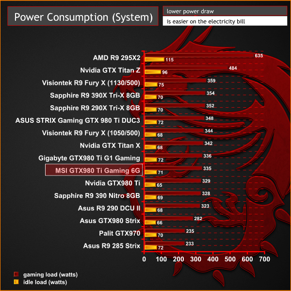Power consumption shows that the MSI GTX980 Ti Gaming 6G system consumes around 335 watts, almost identical to the Gigabyte GTX980 T1 G1 Gaming.