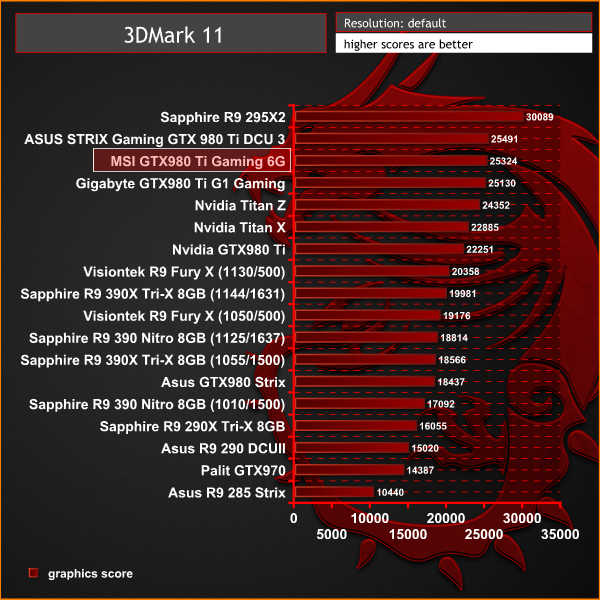 Performance results from the highly overclocked GTX980 Ti cards are very close. The MSI GTX980 Ti Gaming 6G scores 24,324 points putting it close to the very top of the chart.