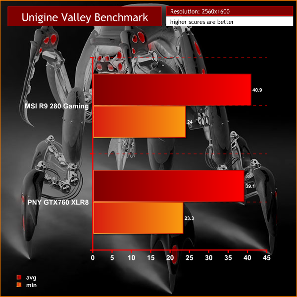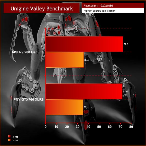 Quite closely matched in this benchmark, with the MSI R9 280 Gaming having a slightly performance advantage.