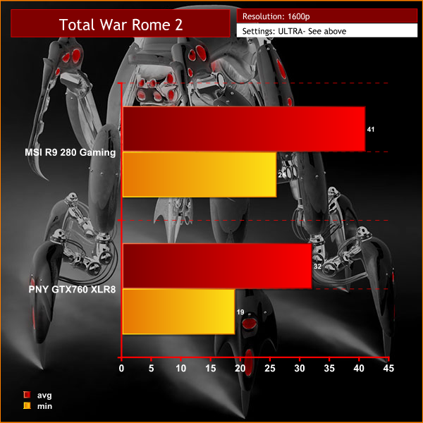 The MSI R9 280 Gaming manages to hold playable frame rates at both 1080p and 1600p. The PNY GTX760 XLR8 struggles to maintain playable frame rates at 1600p and image quality settings would need to be reduced.